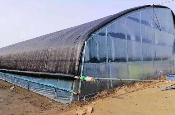?、蹖⒋笈锉乇桓采w在尼龍繩和大棚薄膜上面,并將大棚保溫被的一端固定在墻頂中央,并且不要完全蓋住墻頭,有一定的傾斜度,有利于排水;